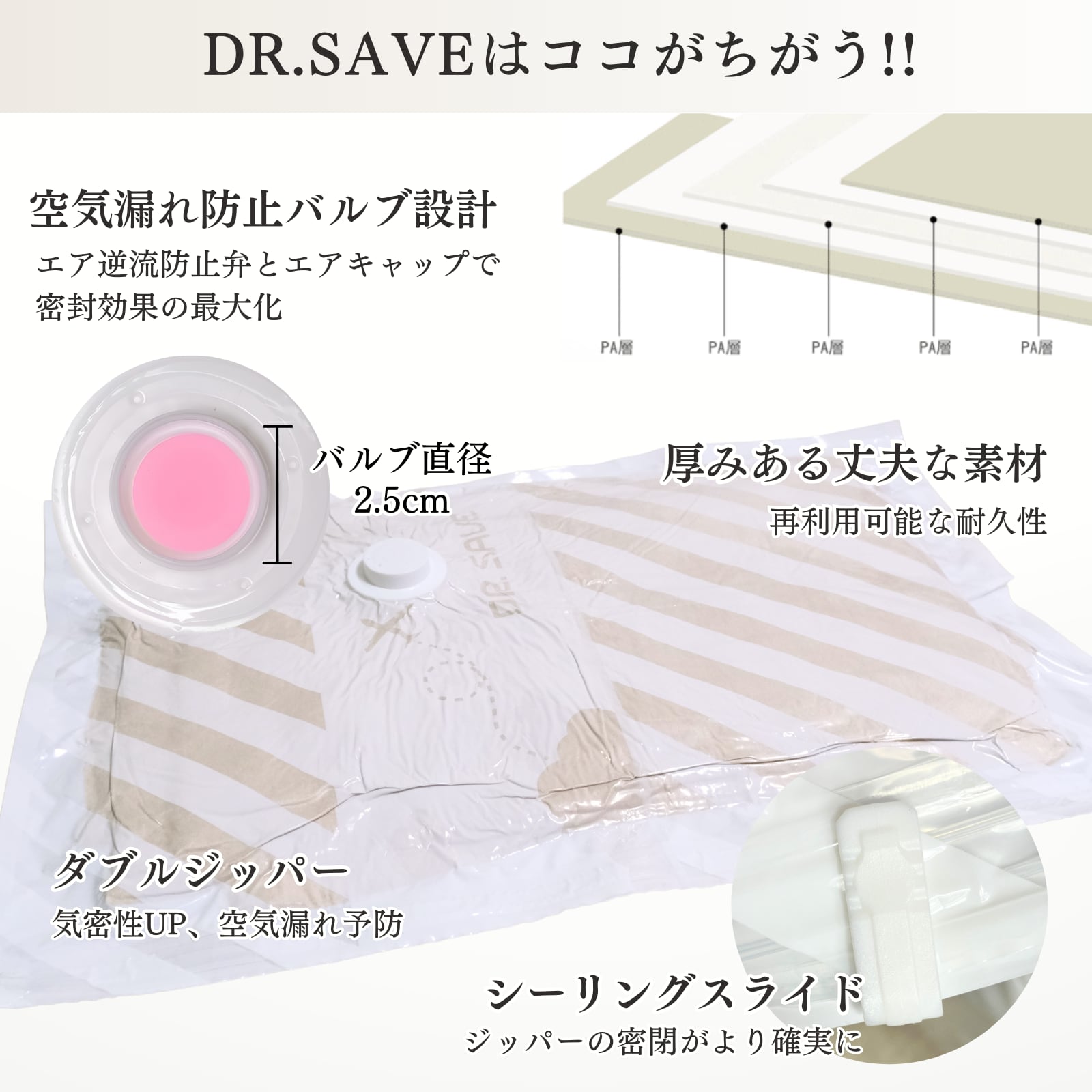 【DR.SAVE】真空衣類収納圧縮袋(ホワイト) S〜Lサイズ (6枚入)
