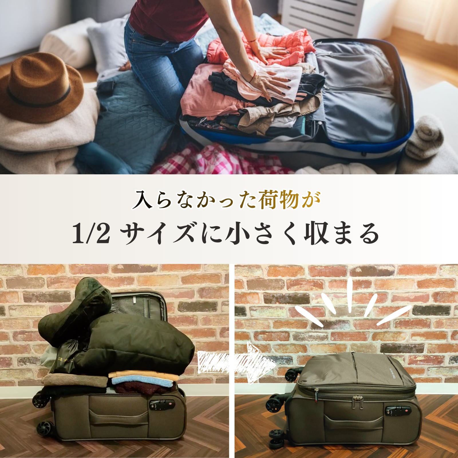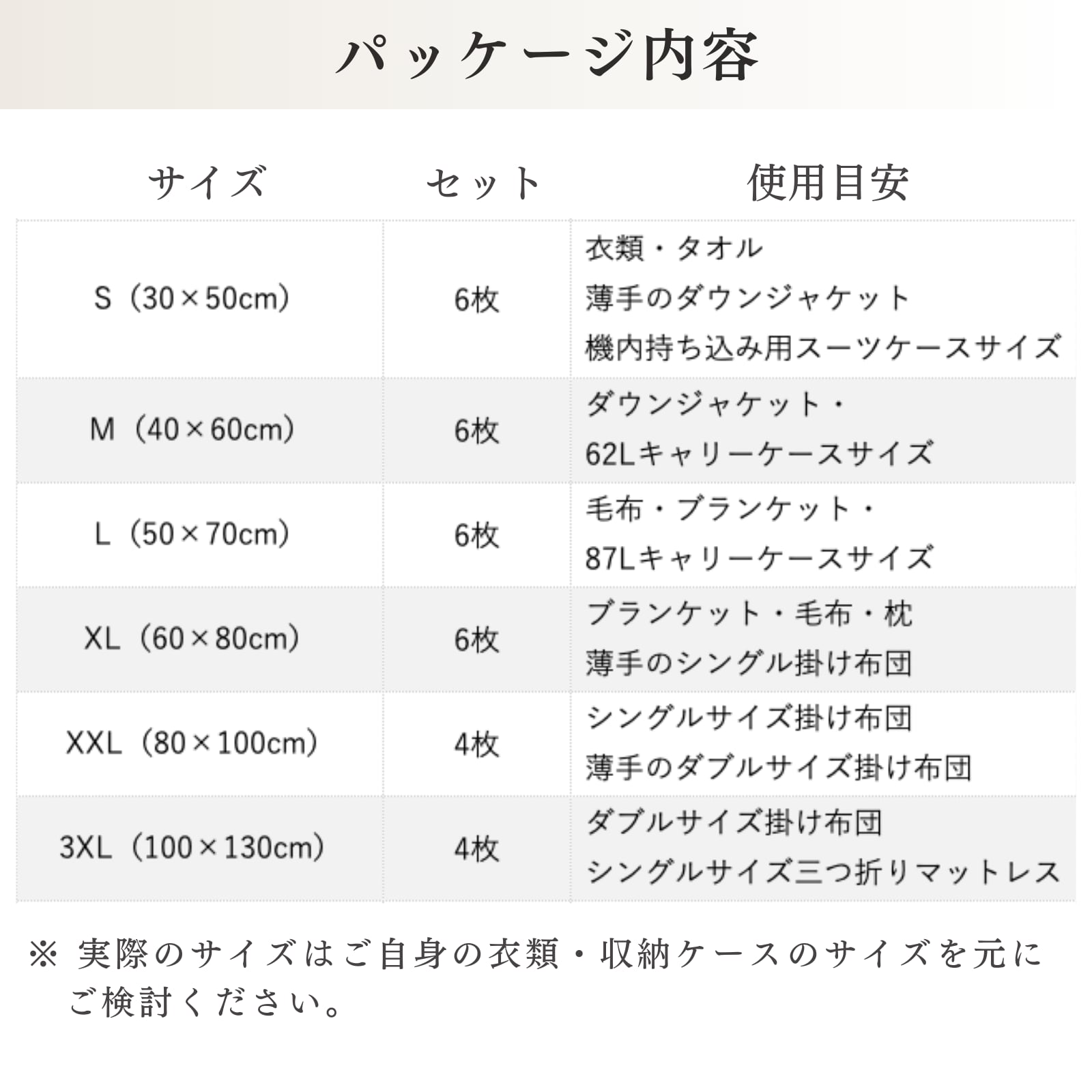 エア逆流弁が施された丈夫なバルブ式圧縮収納袋6枚入。サイズは購入画面の追加オプションよりご選択ください。